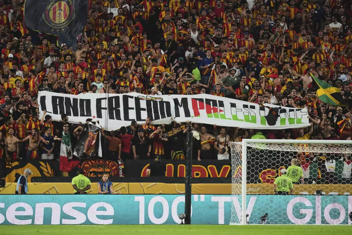 Esperance de Tunis fans hold up a pro-Palestinian banner during the Club World Cup Group D soccer match between Esperance Tunisie and Chelsea in Philadelphia, Tuesday, June 24, 2025. (AP Photo/Chris Szagola)
