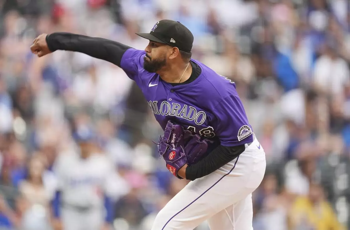 Colorado Rockies starting pitcher Germán Márquez works against the Los Angeles Dodgers in the first inning of a baseball game Tuesday, June 24, 2025, in Denver. (AP Photo/David Zalubowski)