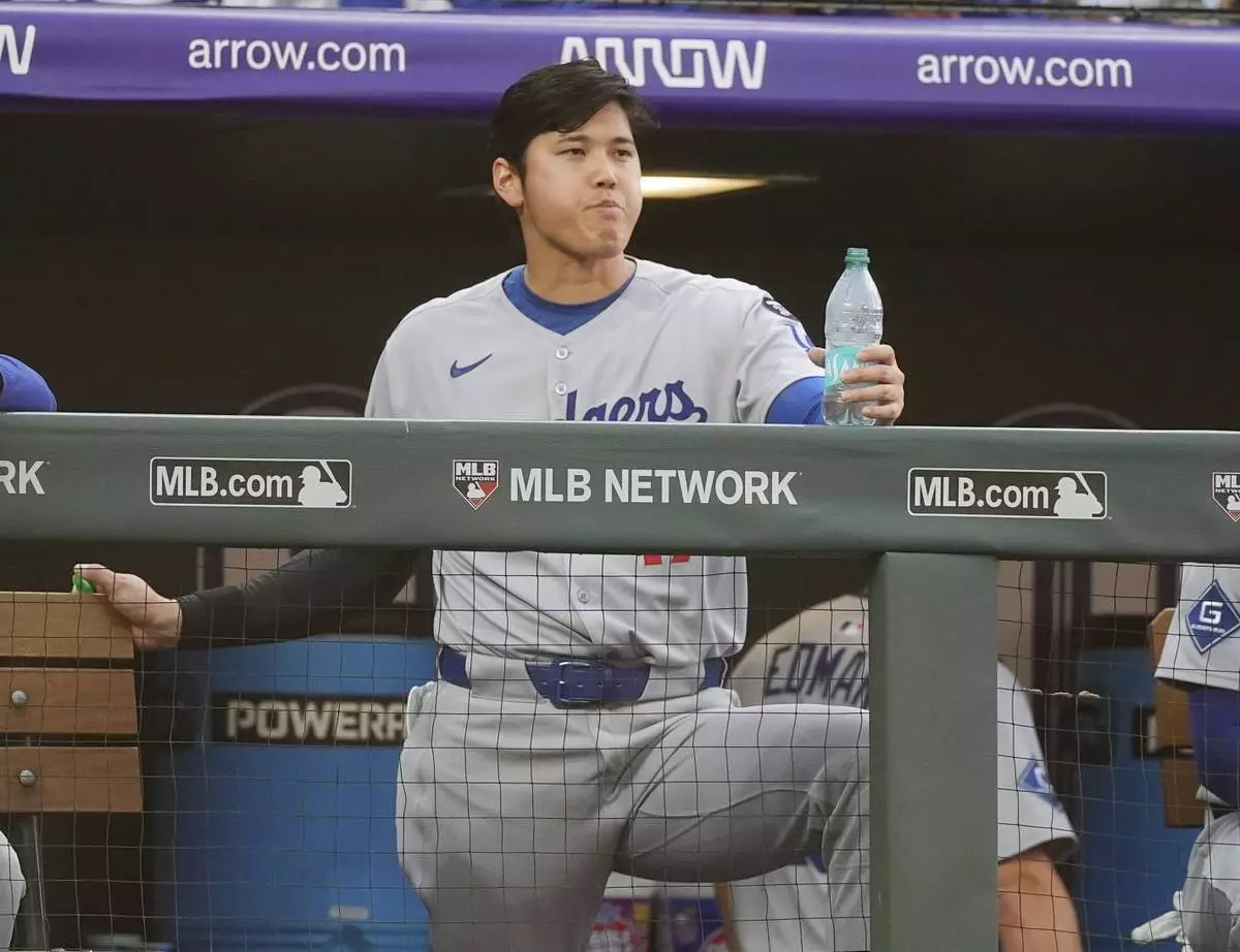 Los Angeles Dodgers designated hitter Shohei Ohtani looks on from the dugout in the fourth inning of a baseball game against the Colorado Rockies, Tuesday, June 24, 2025, in Denver. (AP Photo/David Zalubowski)