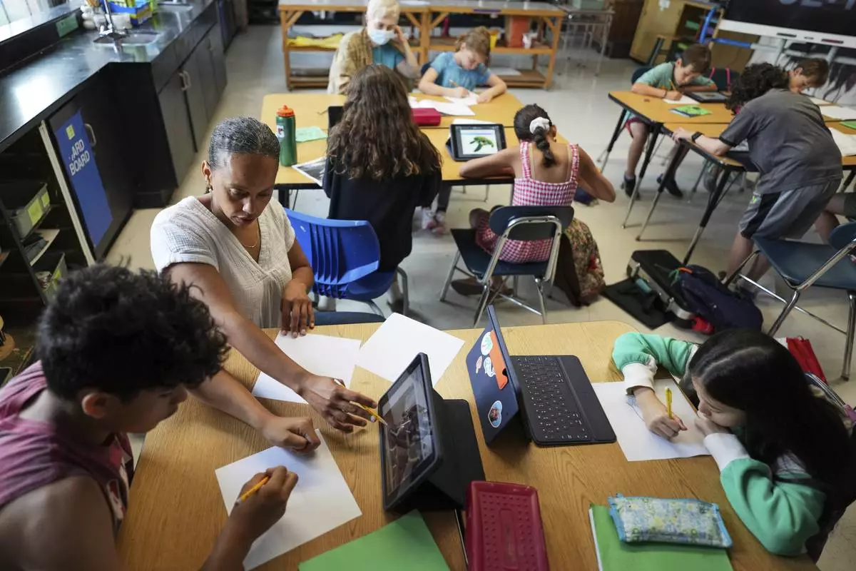 Art teacher Lindsay Johnson teaches to students how to AI for help during a summer class at Roosevelt Middle School, Wednesday, June 25, 2025, in River Forest, Ill. (AP Photo/Nam Y. Huh)