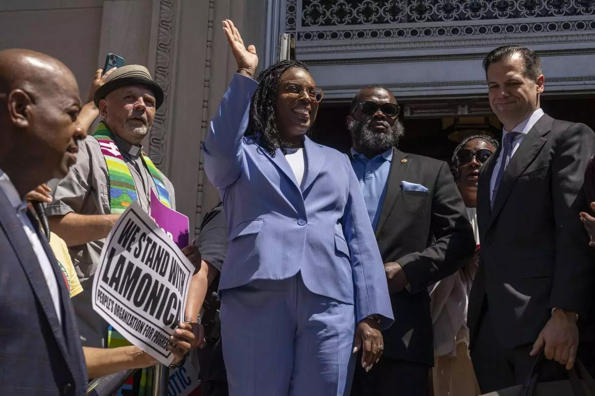 Rep. LaMonica Mclver (D-10th) waves at supporters as she exits a federal court Wednesday, June 25, 2025, in Newark, N.J. (AP Photo/Yuki Iwamura)