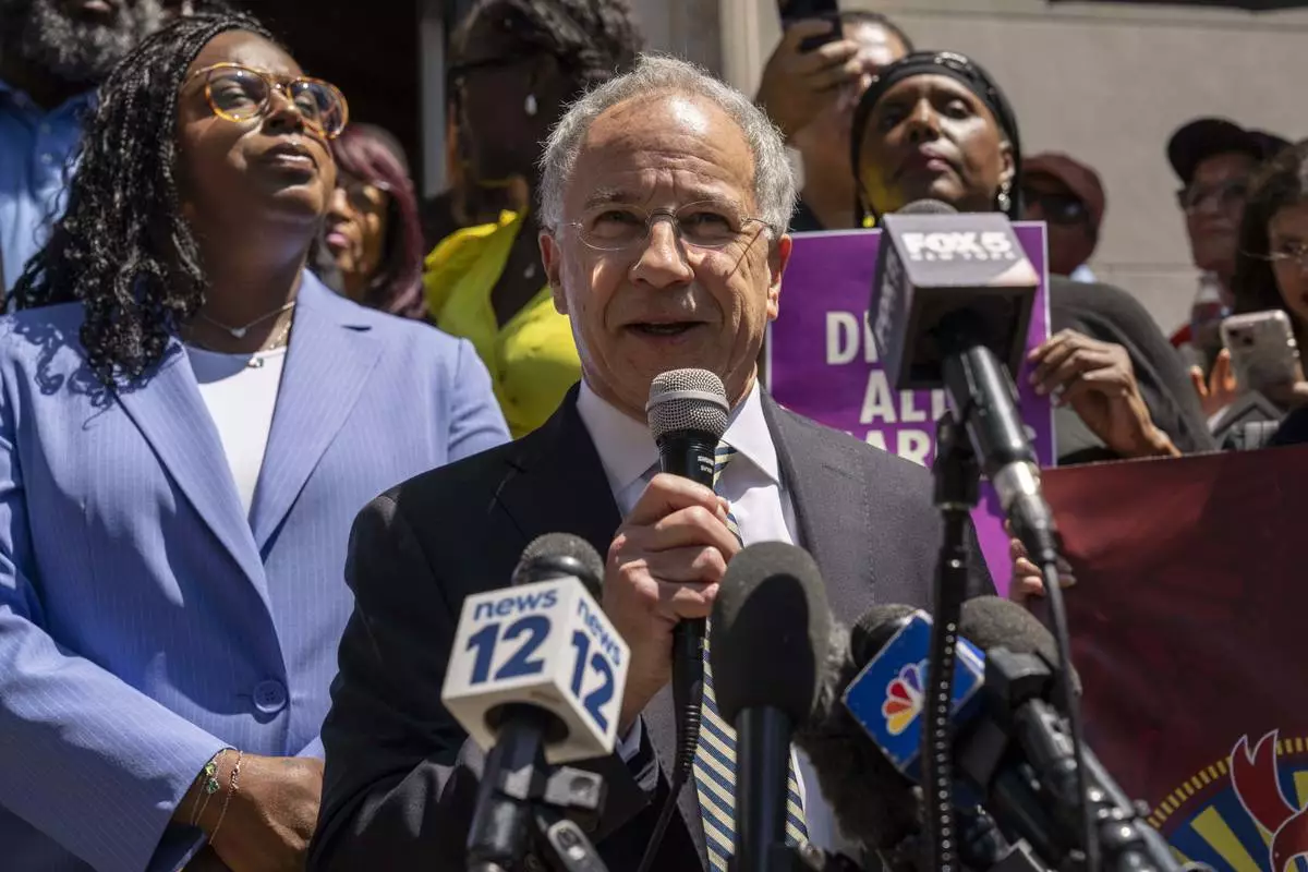 Paul Fishman, attorney for Rep. LaMonica Mclver (D-10th) speaks during a press conference outside a federal court Wednesday, June 25, 2025, in Newark, N.J. (AP Photo/Yuki Iwamura)
