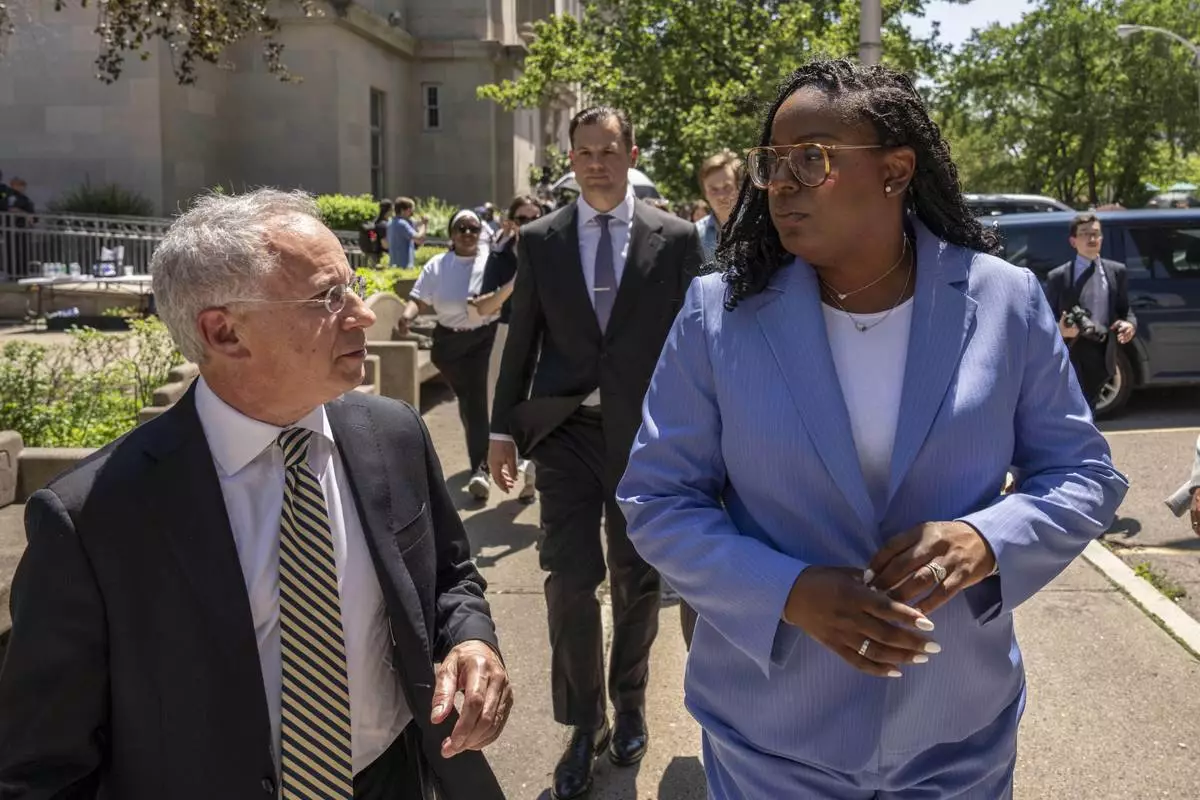 Rep. LaMonica Mclver, right, (D-10th) and attorney Paul Fishman, left, leave a press conference outside a federal court Wednesday, June 25, 2025, in Newark, N.J. (AP Photo/Yuki Iwamura)