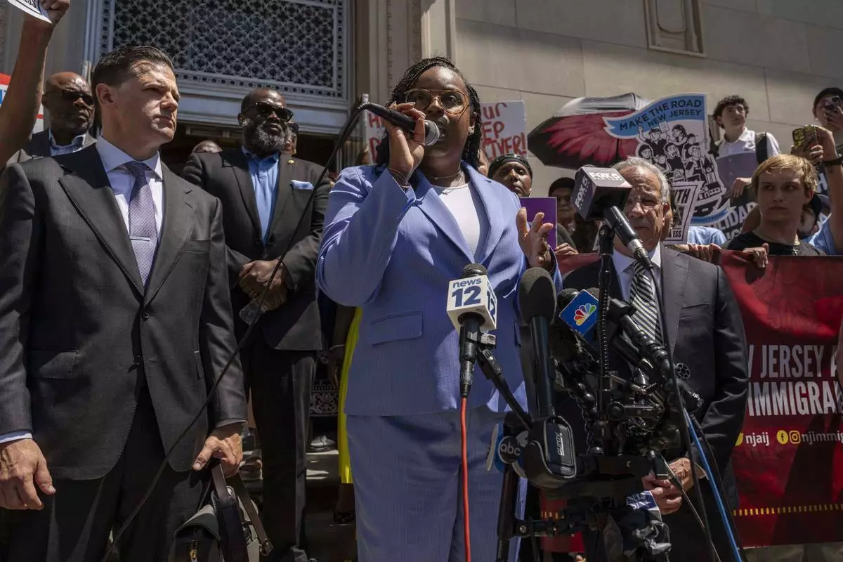 Rep. LaMonica Mclver (D-10th) attends a press conference with her supporters outside a federal court Wednesday, June 25, 2025, in Newark, N.J. (AP Photo/Yuki Iwamura)