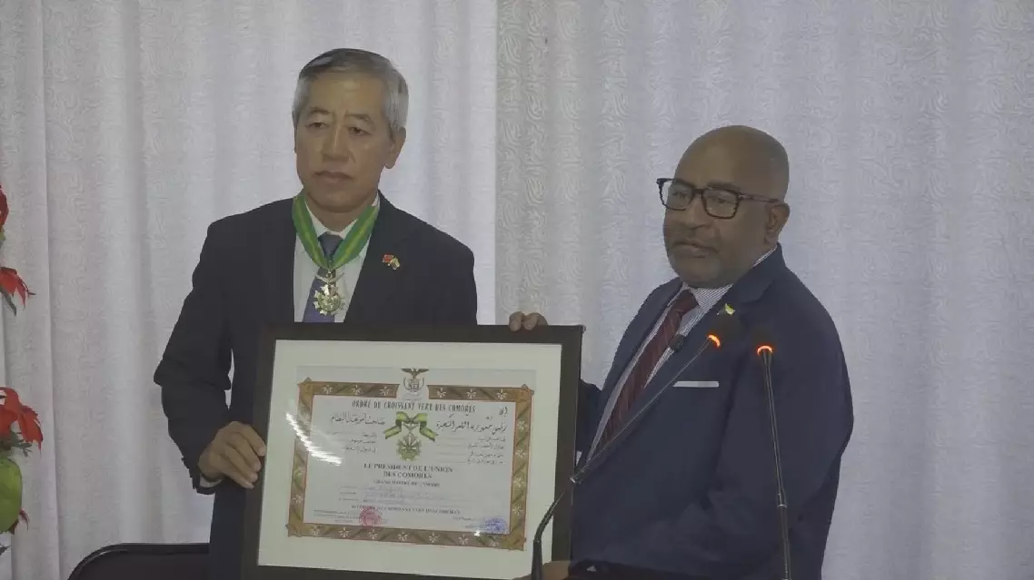 Ahead of his departure, President Assoumani held a ceremony, bestowing the title of Commander of the Order of the Green Crescent, one of the country's highest distinctions, upon the Chinese ambassador, in recognition of his contributions to China-Comoros relations.