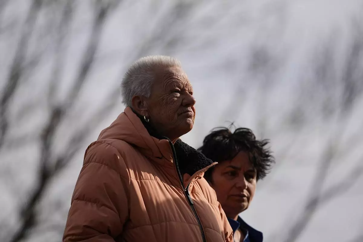 Fran Cooper, center left,, accompanied by her care giver Lily Bubjaku, waits in line durning an emergency food distribution at The Jewish Federation of Greater Philadelphia's Mitzvah Food Program in Philadelphia, Friday, Nov. 7, 2025. (AP Photo/Matt Rourke)