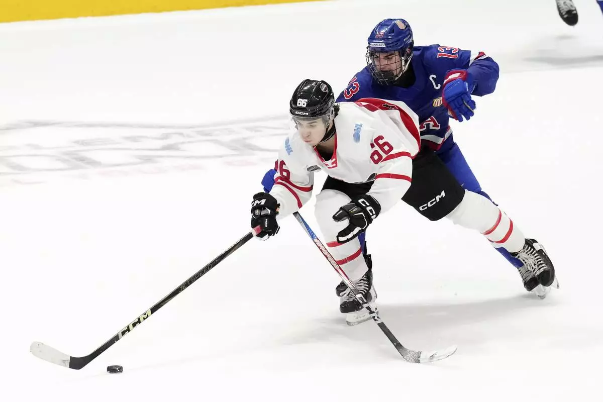 FILE - CHL prospect Michael Misa (66) battles for the puck with USA prospect Asher Barnett during the third period of the CHL-USA Prospects Challenge game in Oshawa, Ontario, Nov. 27, 2024. (Chris Young/The Canadian Press via AP, file)