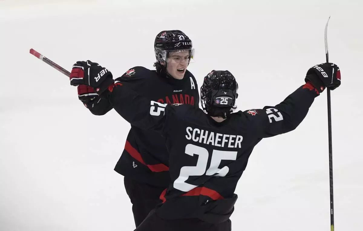 FILE - Canada forward Calum Ritchie, left, celebrates after his goal with defenseman Matthew Schaefer during third-period IIHF World Junior Hockey Championship pretournament action, Dec. 21, 2024, in Ottawa, Ontario. (Adrian Wyld/The Canadian Press via AP, file)