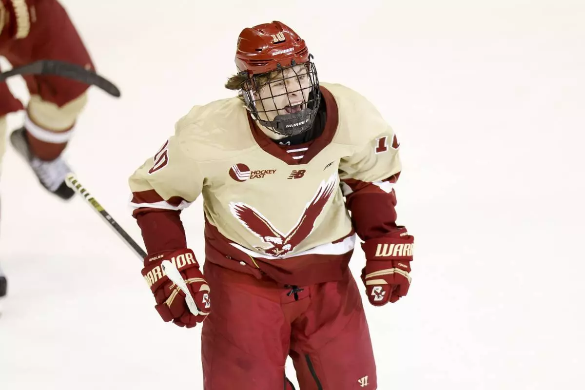 FILE - Boston College forward James Hagens (10) reacts after scoring a goal during the third period of an NCAA hockey regionals game against Bentley on March 28, 2025, in Manchester, N.H. (AP Photo/Greg M. Cooper, file)