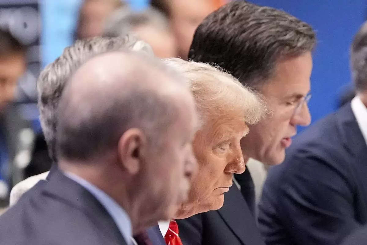 President Donald Trump listens to NATO Secretary General Mark Rutte, right, during a plenary session at the NATO summit in The Hague, Netherlands, Wednesday, June 25, 2025. (AP Photo/Alex Brandon)