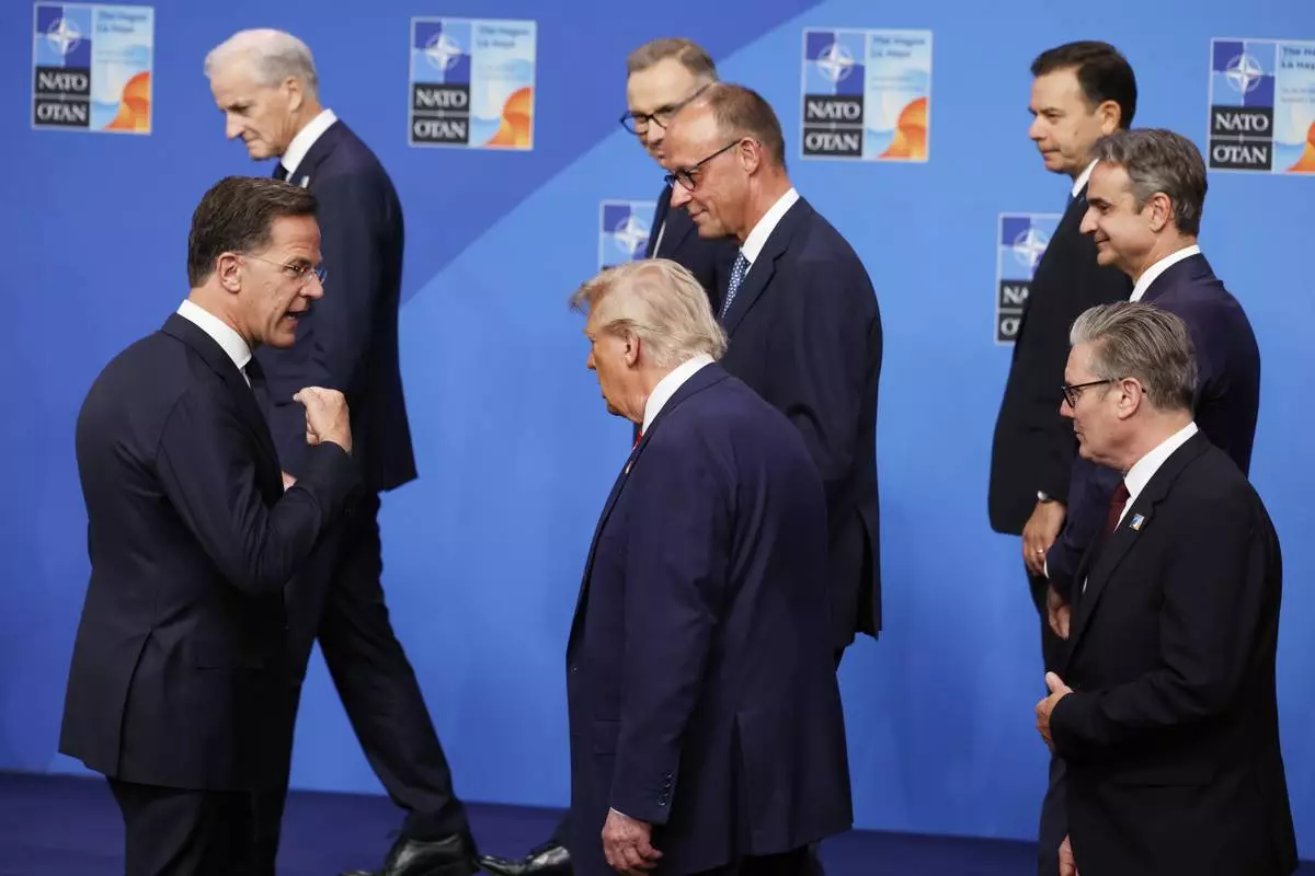 President Donald Trump, center left, walks by Denmark's Prime Minister Mette Frederiksen, center front, prior to a group photo of NATO heads of state and government at the NATO summit in The Hague, Netherlands, Wednesday, June 25, 2025. (AP Photo/Geert Vanden Wijngaert)