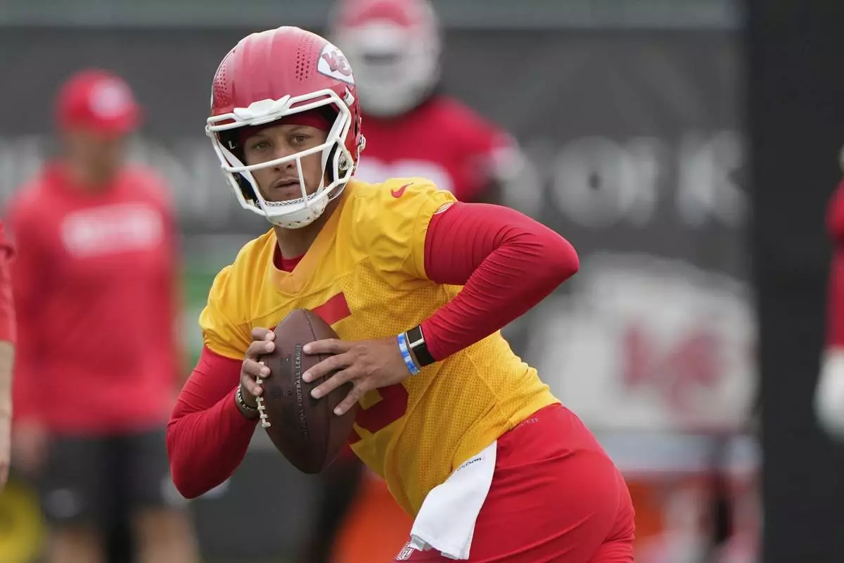 Kansas City Chiefs quarterback Patrick Mahomes looks to pass during the NFL football team's practice Tuesday, June 17, 2025, in Kansas City, Mo. (AP Photo/Charlie Riedel)