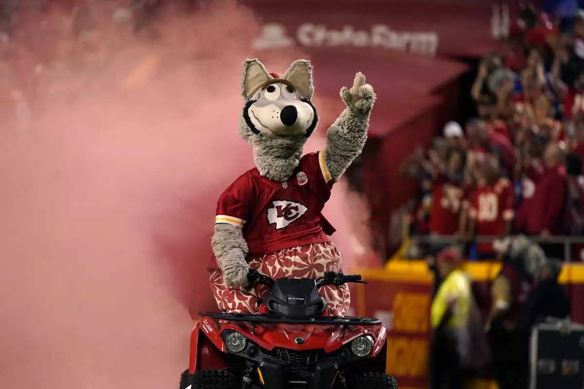 FILE - The Kansas City Chiefs mascot, KC Wolf, is seen, before the start of an NFL football game between the Kansas City Chiefs and the Buffalo Bills Sunday, Oct. 10, 2021, in Kansas City, Mo. (AP Photo/Charlie Riedel, File)