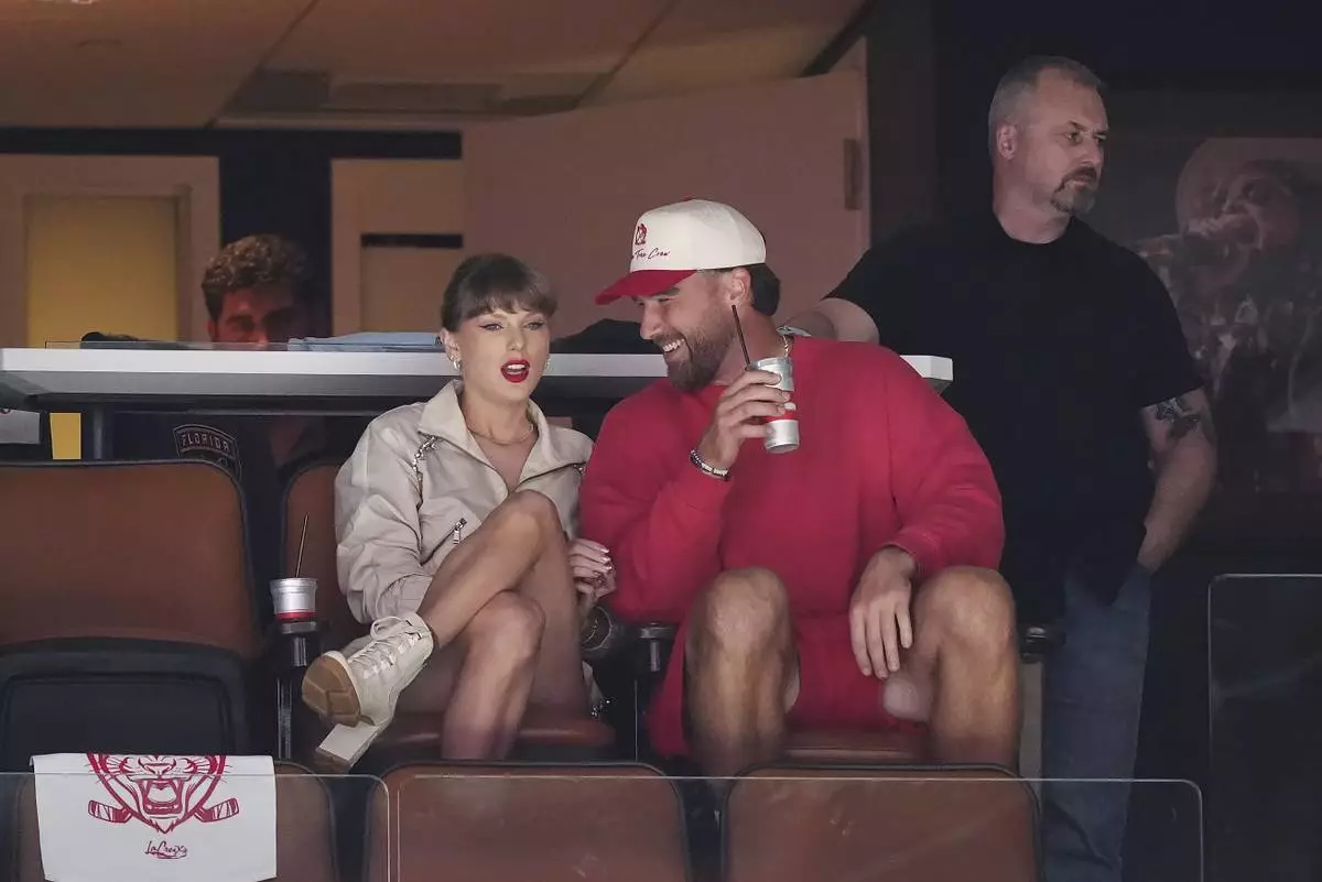 Singer Taylor Swift, front left, and Kansas City Chiefs football player Travis Kelce, front right, take in the third period in Game 4 of the NHL hockey Stanley Cup Final between the Edmonton Oilers and the Florida Panthers in Sunrise, Fla., Thursday, June 12, 2025. (Nathan Denette/The Canadian Press via AP)
