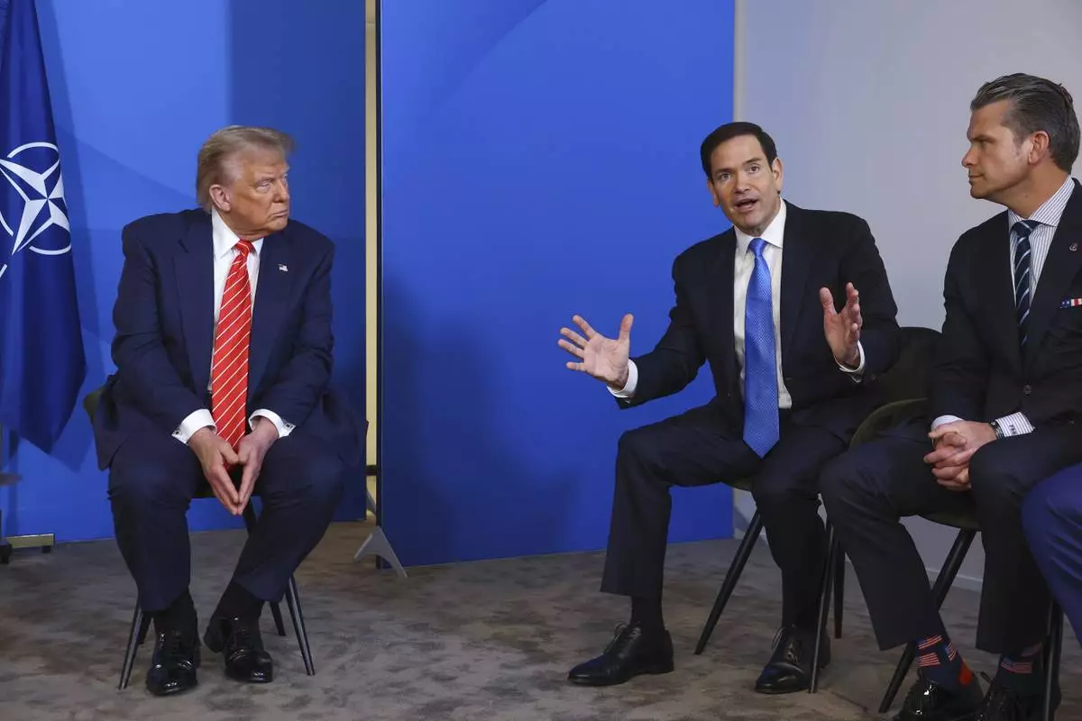 From right, Defense Secretary Pete Hegseth, Secretary of State Marco Rubio and President Donald Trump during a meeting with NATO Secretary General Mark Rutte at the NATO summit in The Hague, Netherlands, Wednesday, June 25, 2025. (Piroschka Van De Wouw, Pool Photo via AP)