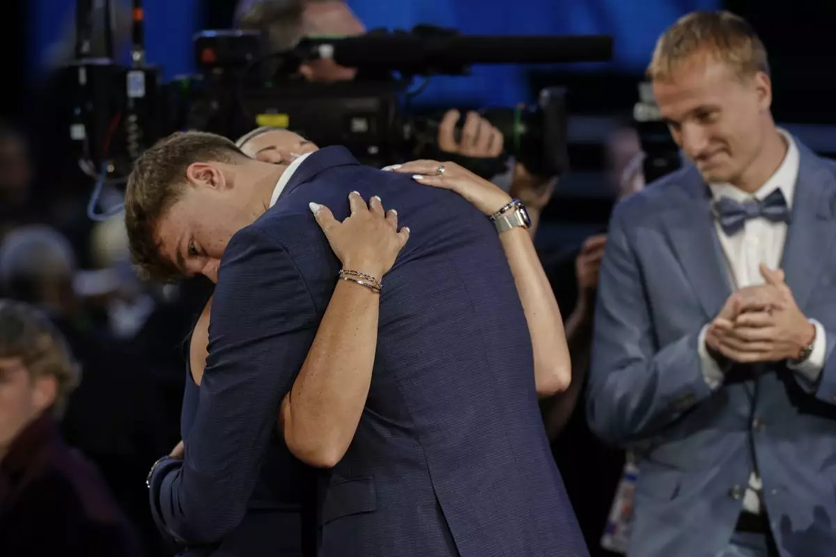 Cooper Flagg hugs family members after being selected first overall by the Dallas Mavericks In the first round of the NBA basketball draft, Wednesday, June 25, 2025, in New York. (AP Photo/Adam Hunger)