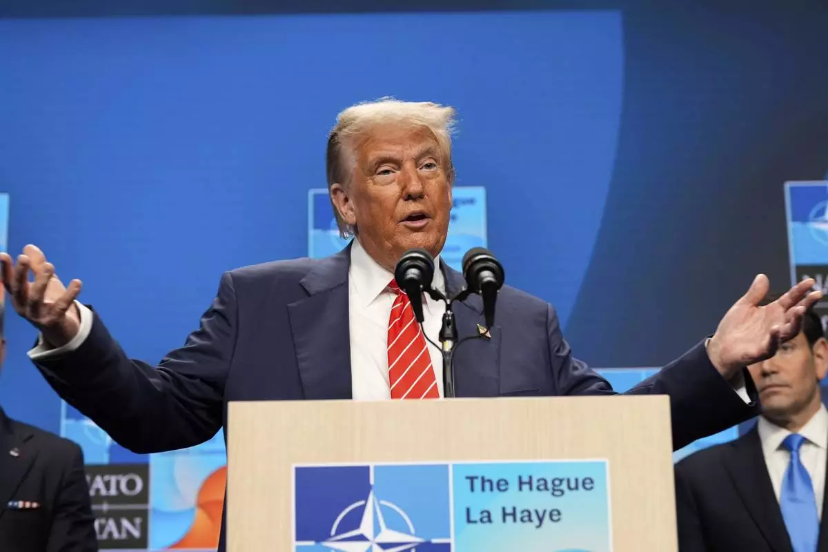 President Donald Trump gestures as he speaks during a media conference at the end of the NATO summit in The Hague, Netherlands, Wednesday, June 25, 2025. (AP Photo/Alex Brandon)