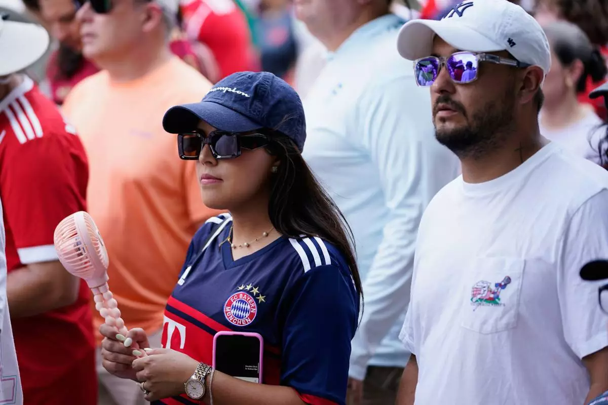 Camila Hernandez and her husband Camilo wait in line to enter Bank of America Stadium for a Club World Cup game, Tuesday, June 24, 2025, in Charlotte, N.C. (AP Photo/Erik Verduzco)