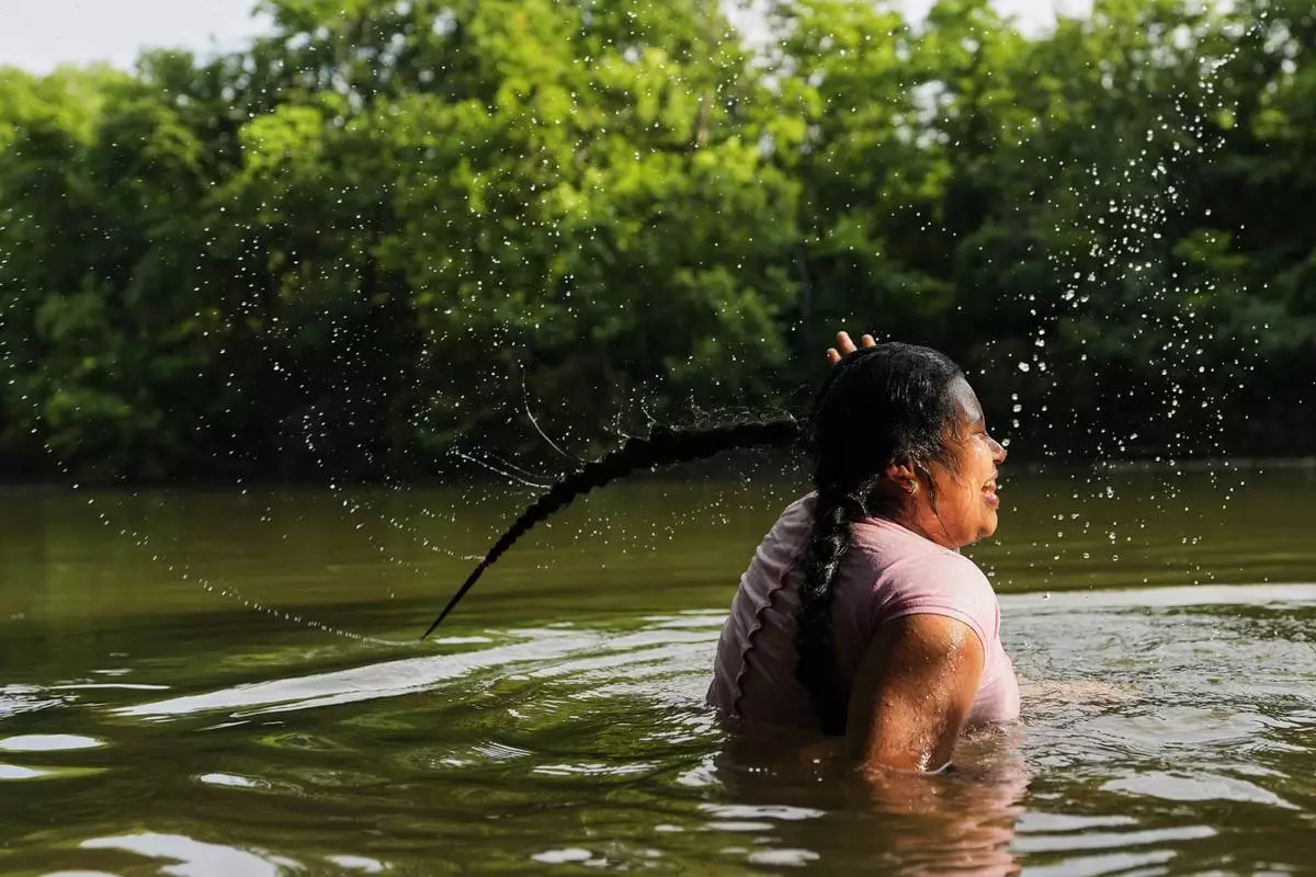 Sevlin Mendez cools off in the Harpeth River as the heat index reaches 100 degrees Fahrenheit, Wednesday, June 25, 2025, in Nashville, Tenn. (AP Photo/George Walker IV)