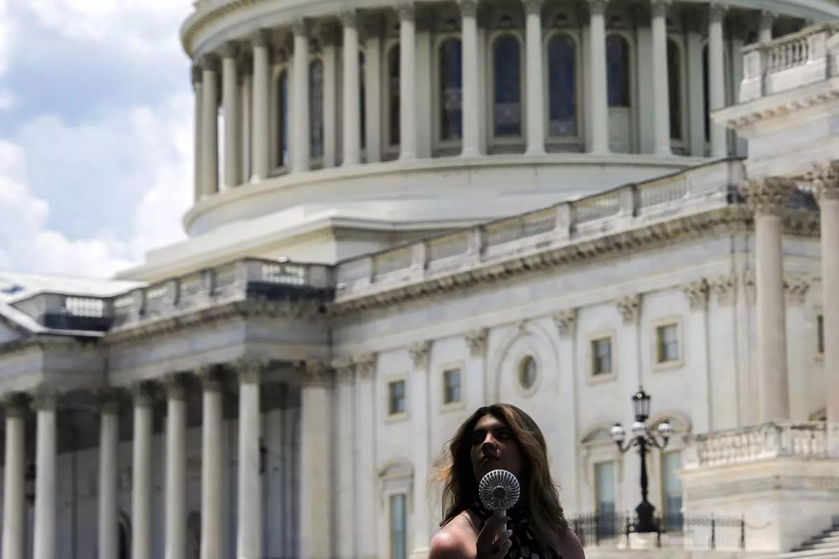 A woman uses a portable fan to cool down Wednesday, June 25, 2025, outside the U.S. Capitol in Washington. (AP Photo/Julia Demaree Nikhinson)