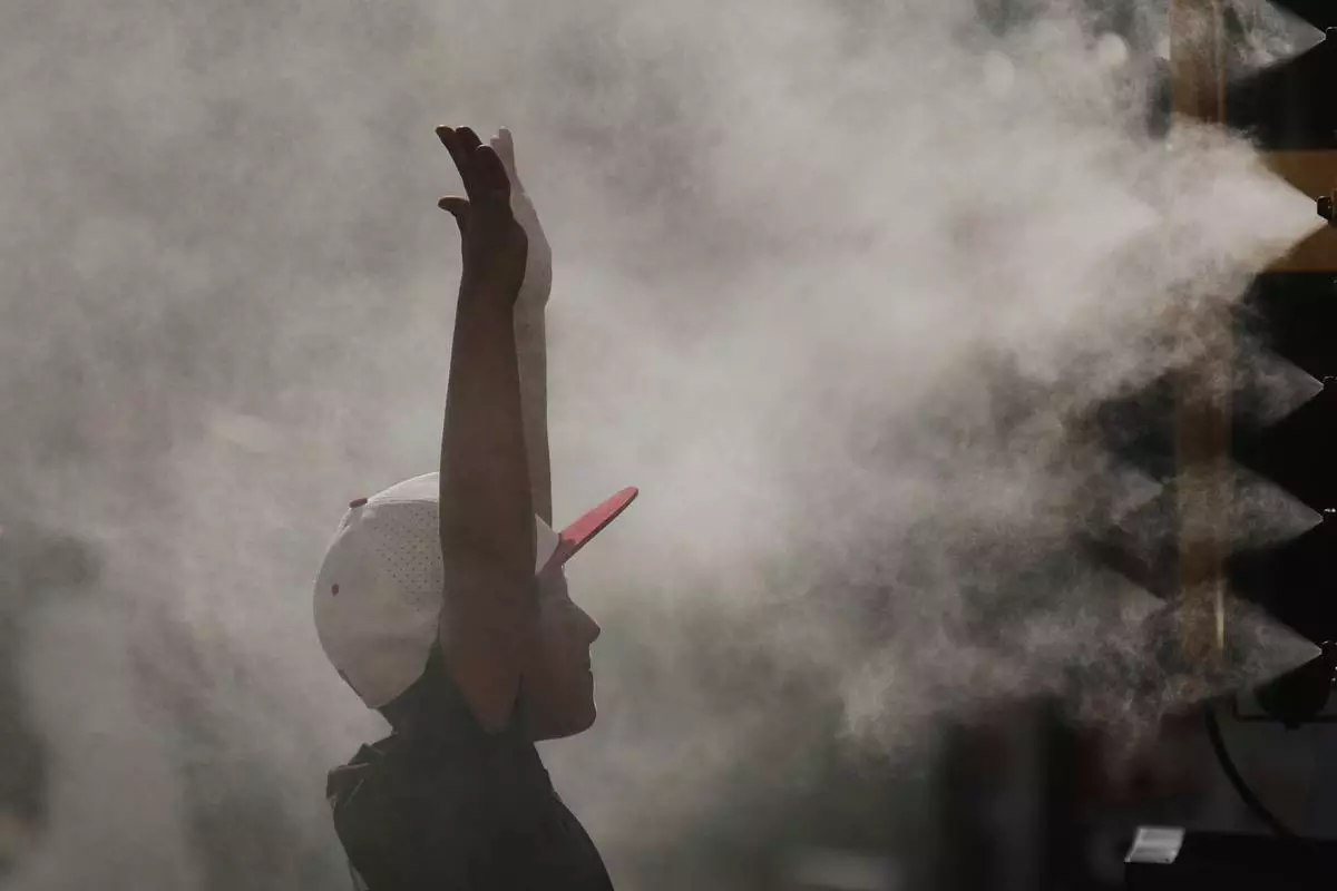 A boy cools off in a mister at Kauffman Stadium before a baseball game between the Kansas City Royals and the Tampa Bay Rays, Wednesday, June 25, 2025, in Kansas City, Mo. (AP Photo/Charlie Riedel)