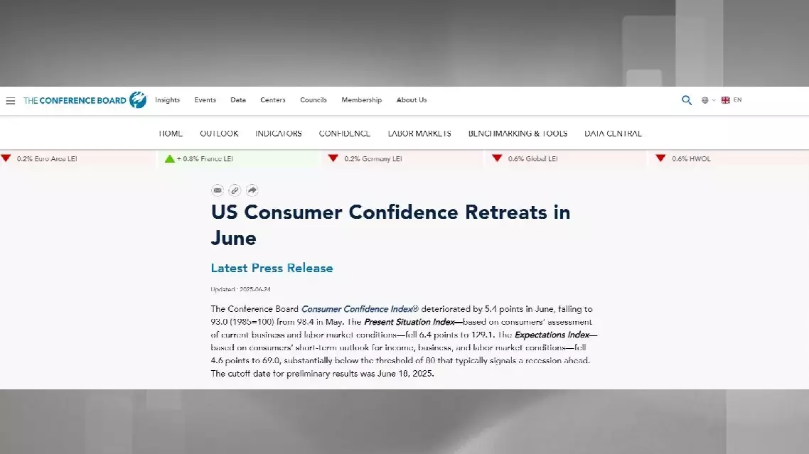 The U.S. consumer confidence index dropped by 5.4 points in June, falling to 93.0 from 98.4 in May, according to the latest survey results published by The Conference Board, a U.S. non-profit research organization, on Tuesday morning.