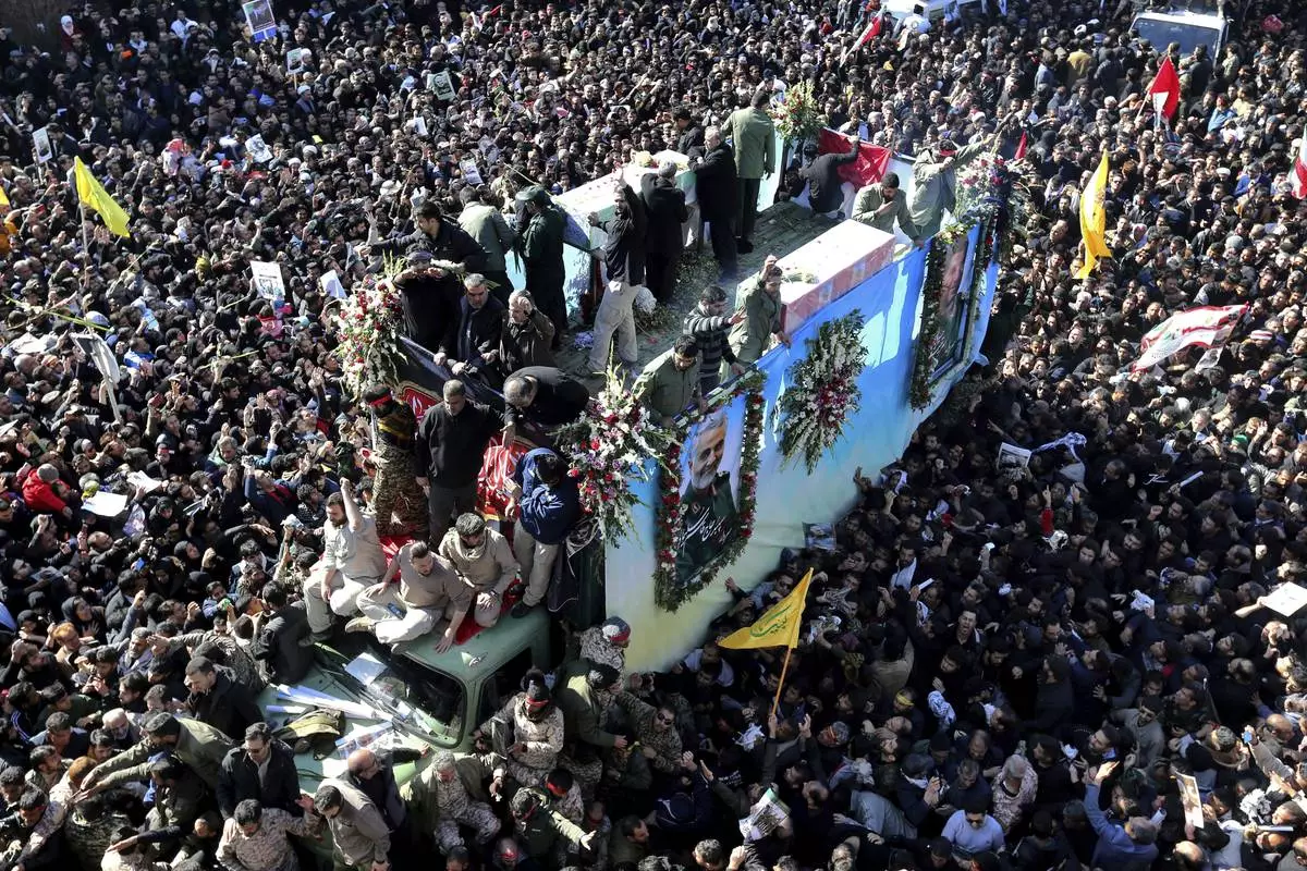 FILE - Coffins of Gen. Qassem Soleimani and others who were killed in Iraq by a U.S. drone strike, are carried on a truck surrounded by mourners during a funeral procession, in the city of Kerman, Iran, Jan. 7, 2020. (AP Photo, File)