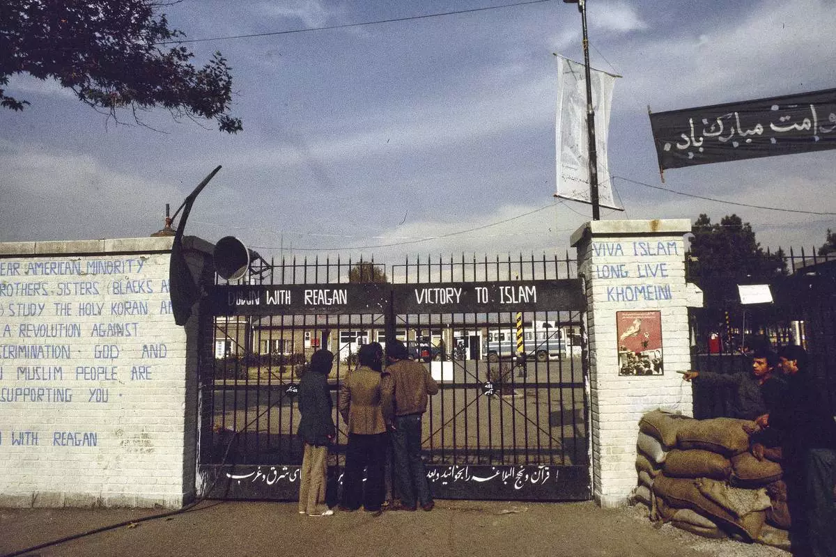 FILE - The entrance to the U.S. Embassy in Tehran, Iran, where 63 people are being held hostage, seen in 1980. Graffiti on the wall at left reads: "Dear American minority, brothers and sisters (Blacks and Indians) study the holy Koran and start a revolution against U.S. discrimination. God and Iranian Muslim people are supporting you. Down with Reagan." (AP Photo, File)
