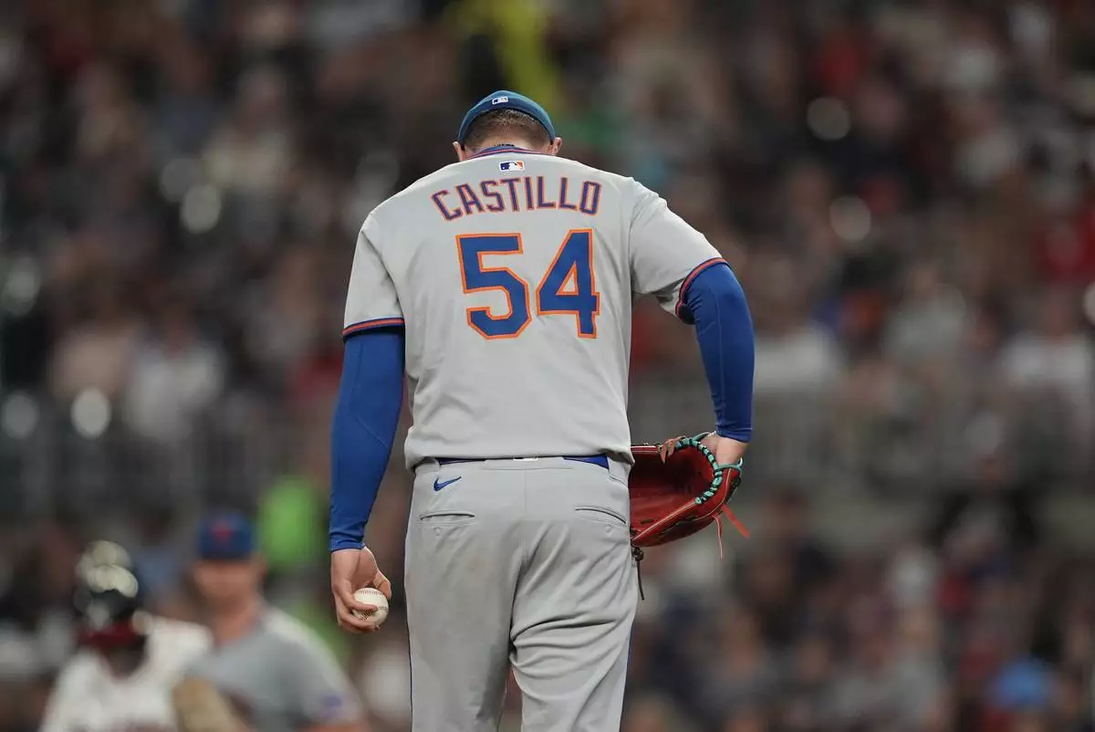 New York Mets pitcher José Castillo (54) works on the mound against the Atlanta Braves in the sixth inning of a baseball game, Wednesday, June 18, 2025, in Atlanta. (AP Photo/Mike Stewart)