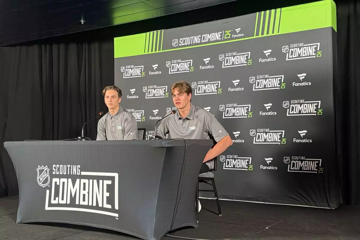 Swedish teammates Victor Eklund, left, and Anton Frondell address reporters while attending the NHL pre-draft combine in Buffalo, N.Y., June 6, 2025. The two played together for Djurgarden, in Sweden Tier 2 pro league, and both projected to be first-round picks in the NHL draft this weekend. (AP Photo/John Wawrow)