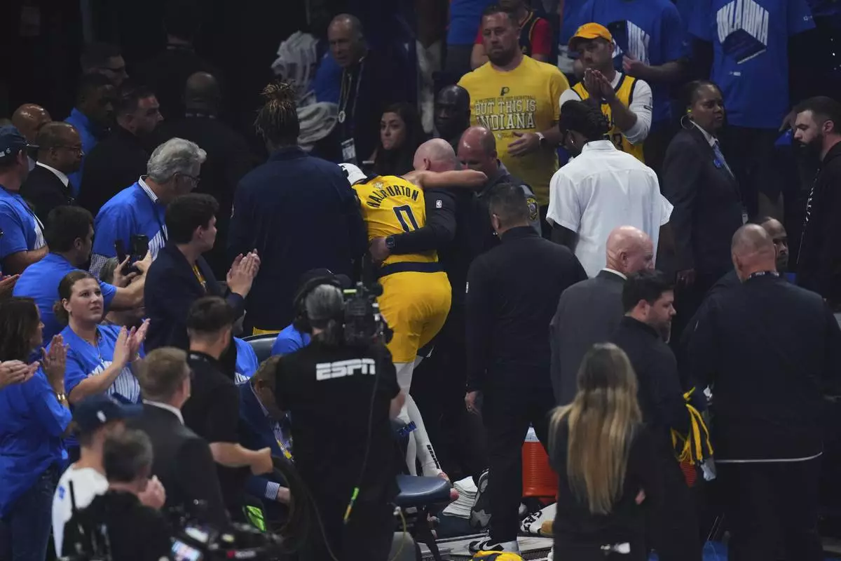 Indiana Pacers guard Tyrese Haliburton (0) leaves the court with an injury during the first half of Game 7 of the NBA Finals basketball series against the Oklahoma City Thunder Sunday, June 22, 2025, in Oklahoma City. (AP Photo/Nate Billings)