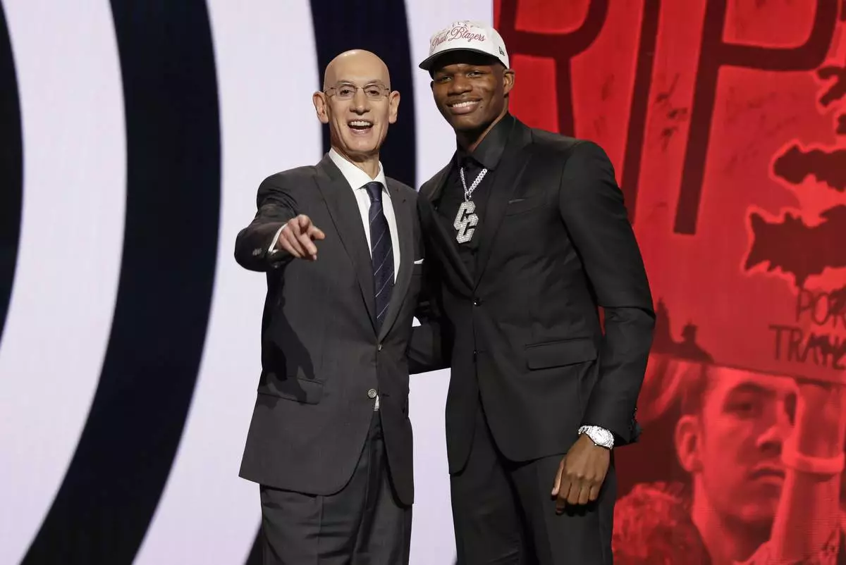 Cedric Coward poses for a photo with NBA commissioner Adam Silver after being selected 11th by the Portland Trail Blazers in the first round of the NBA basketball draft, Wednesday, June 25, 2025, in New York. (AP Photo/Adam Hunger)