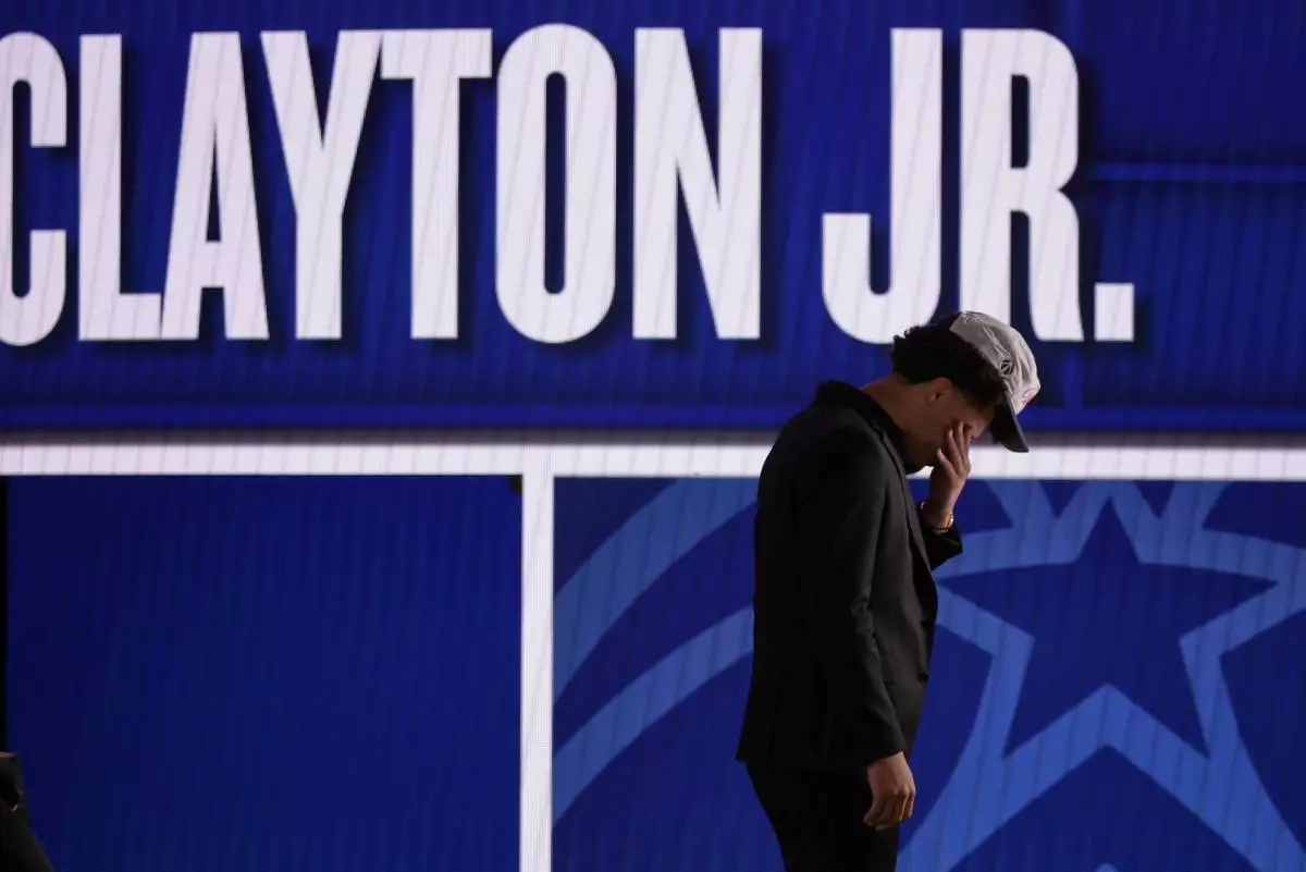 Walter Clayton Jr. reacts after being selected 18th by the Washington Wizards in the first round of the NBA basketball draft, Wednesday, June 25, 2025, in New York. (AP Photo/Adam Hunger)