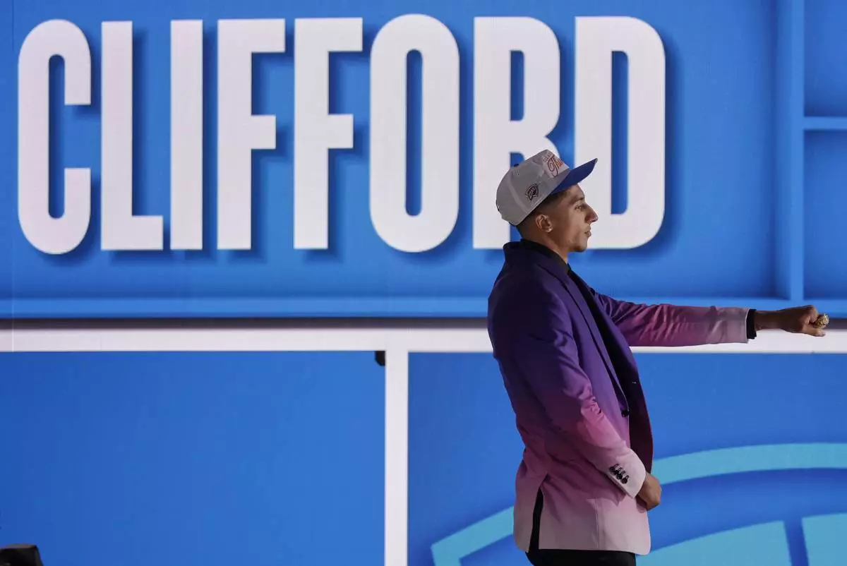 Nique Clifford poses for a camera after being selected 24th by the Oklahoma City Thunder in the first round of the NBA basketball draft, Wednesday, June 25, 2025, in New York. (AP Photo/Adam Hunger)