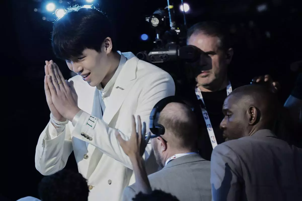 Yang Hansen reacts after being selected 16th by the Memphis Grizzlies in the first round of the NBA basketball draft, Wednesday, June 25, 2025, in New York. (AP Photo/Adam Hunger)
