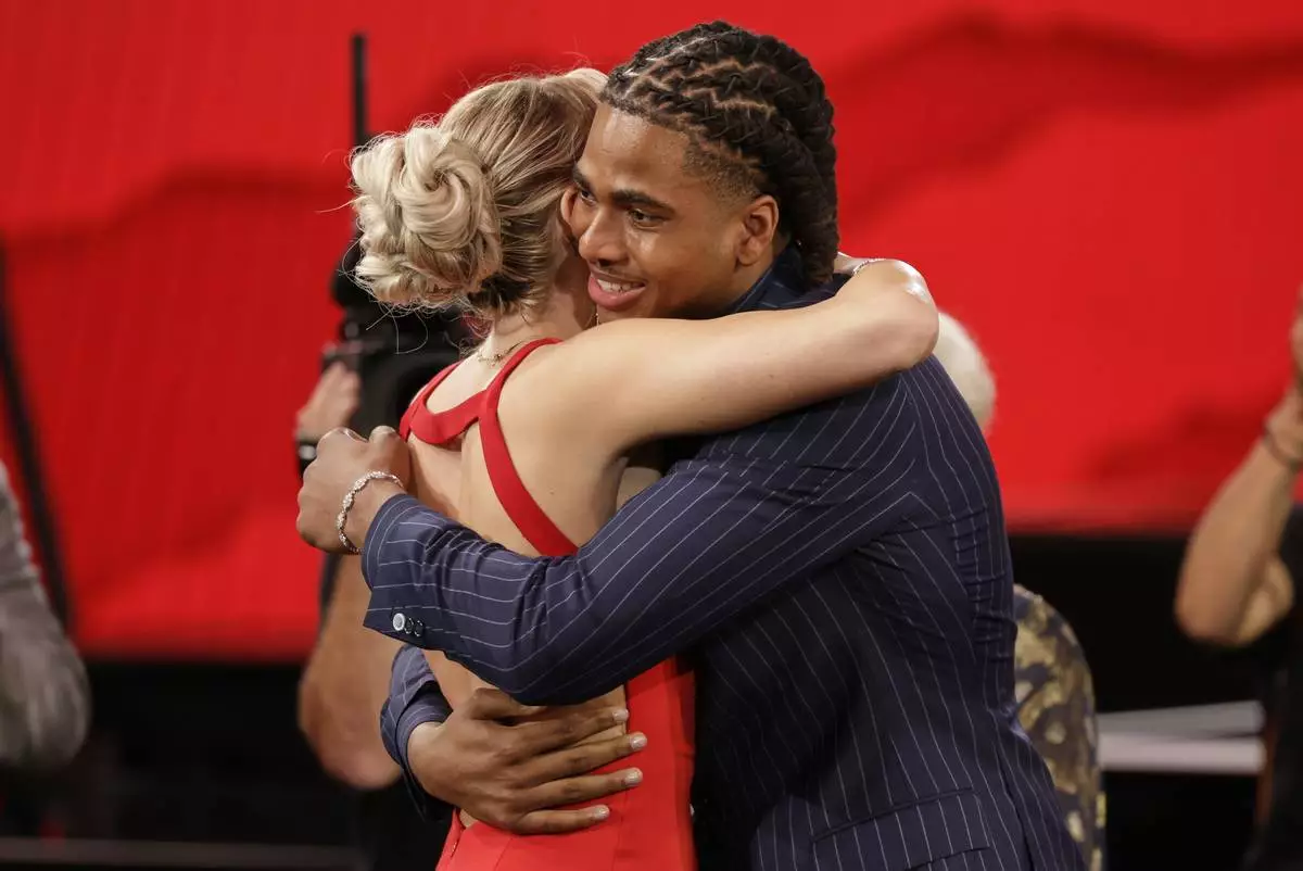 Jeremiah Fears celebrates with family after being selected seventh by the New Orleans Pelicans in the first round of the NBA basketball draft, Wednesday, June 25, 2025, in New York. (AP Photo/Adam Hunger)