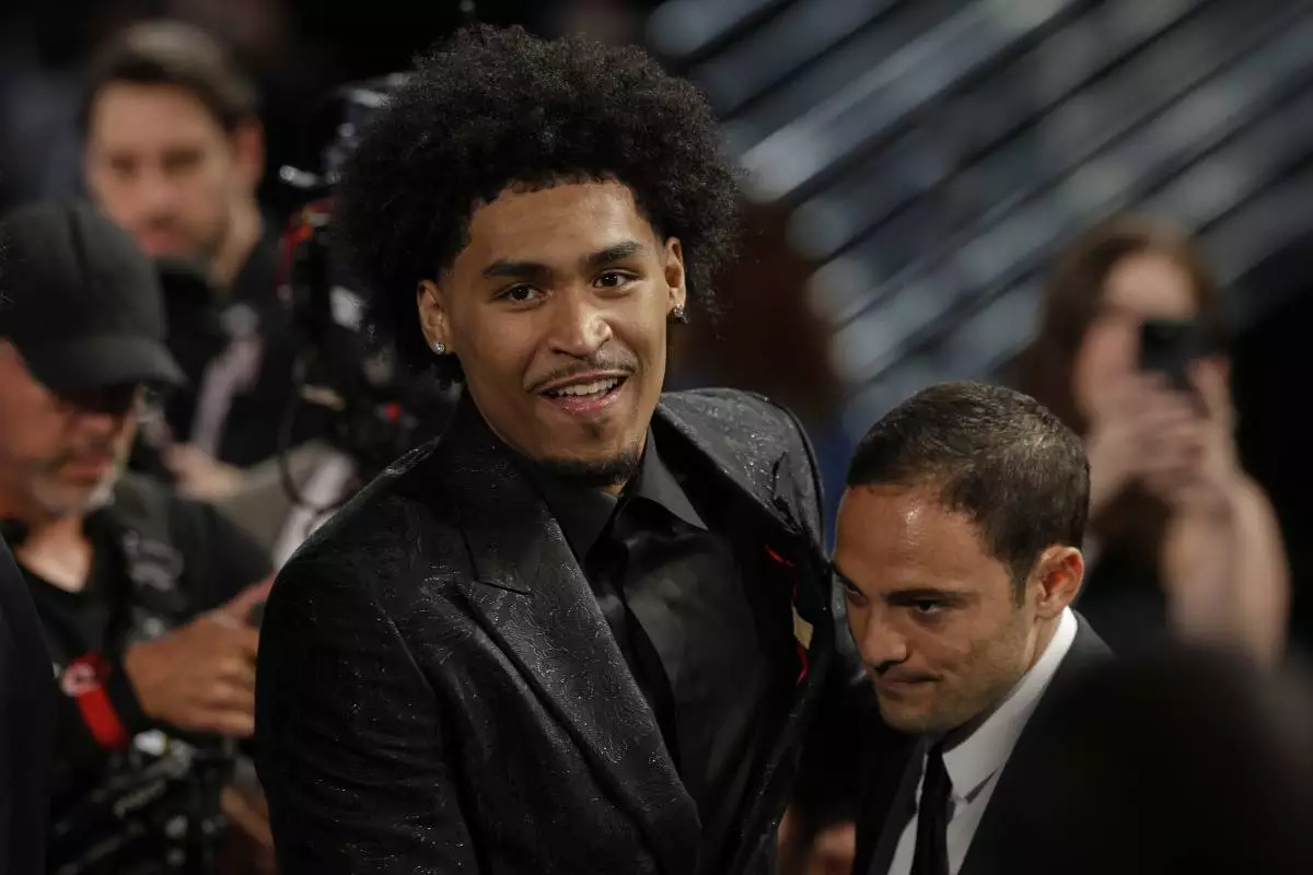 Dylan Harper reacts after being selected second by the San Antonio Spurs In the first round of the NBA basketball draft, Wednesday, June 25, 2025, in New York. (AP Photo/Adam Hunger)