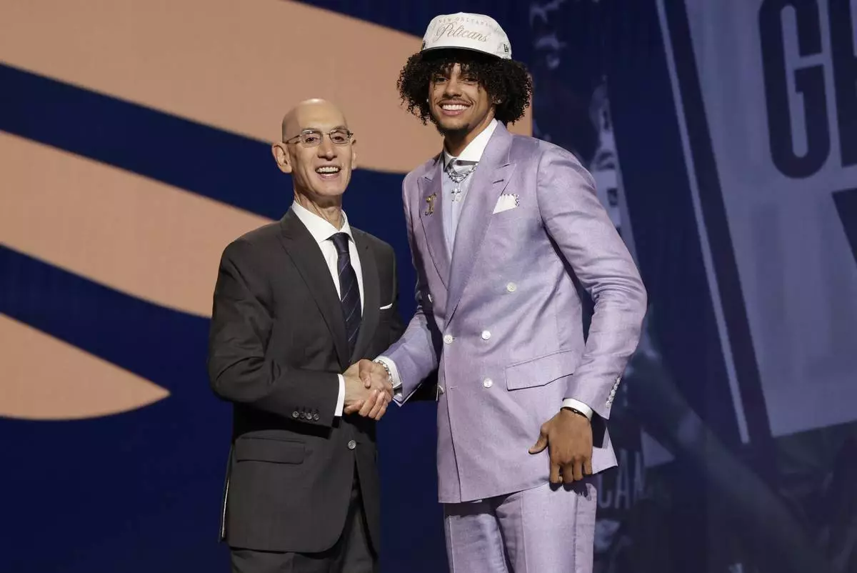 Asa Newell poses for a photo with NBA commissioner Adam Silver after being selected 23rd by the New Orleans Pelicans in the first round of the NBA basketball draft, Wednesday, June 25, 2025, in New York. (AP Photo/Adam Hunger)