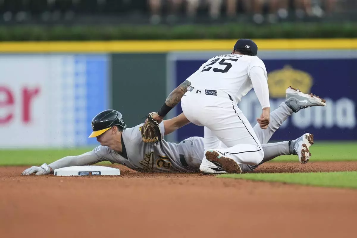 Detroit Tigers second baseman Gleyber Torres (25) tags Athletics' Tyler Soderstrom (21) out attempting to steal second base in the sixth inning during a baseball game, Wednesday, June 25, 2025, in Detroit. (AP Photo/Paul Sancya)