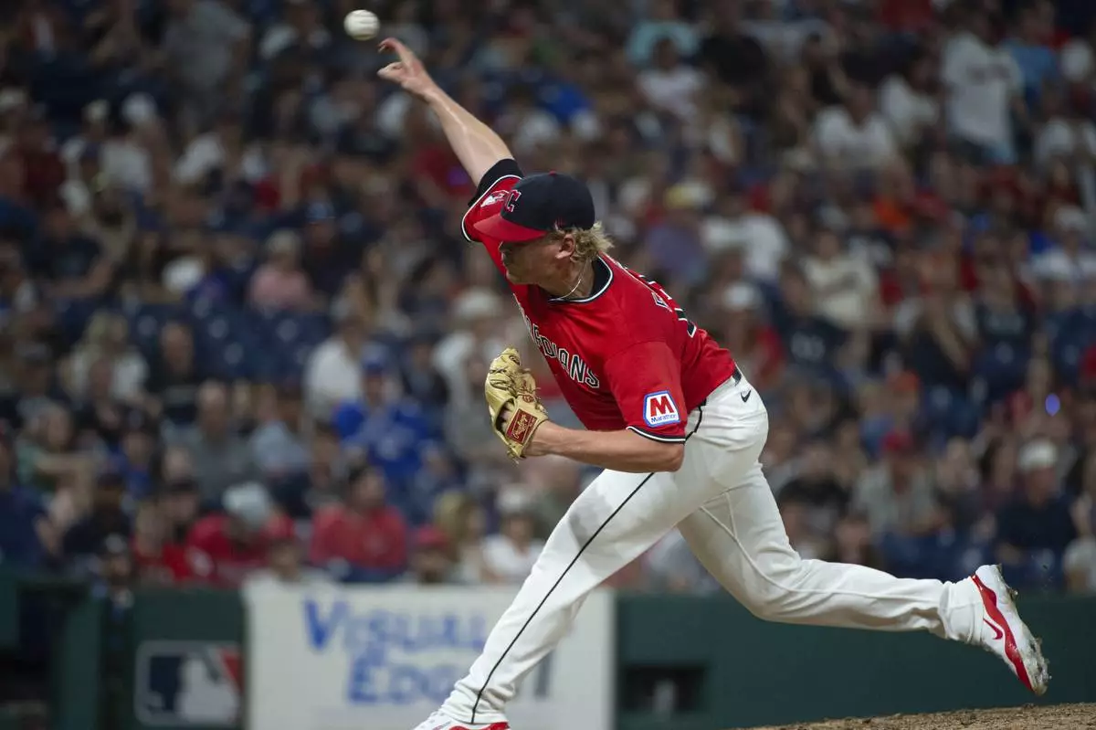 Cleveland Guardians relief pitcher Nic Enright delivers against the Toronto Blue Jays during the 10th inning of a baseball game, Wednesday, June 25, 2025, in Cleveland. (AP Photo/Phil Long)