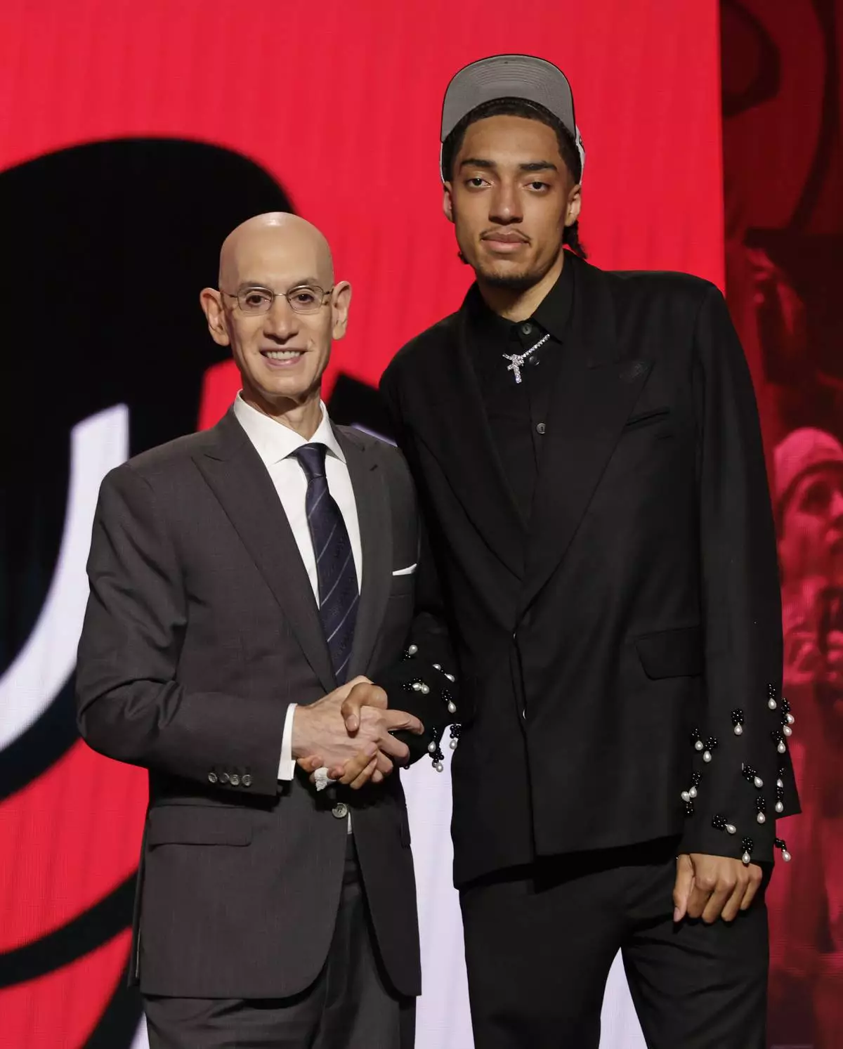 Noa Essengue poses for a photo with NBA commissioner Adam Silver after being selected 12th by the Chicago Bulls in the first round of the NBA basketball draft, Wednesday, June 25, 2025, in New York. (AP Photo/Adam Hunger)