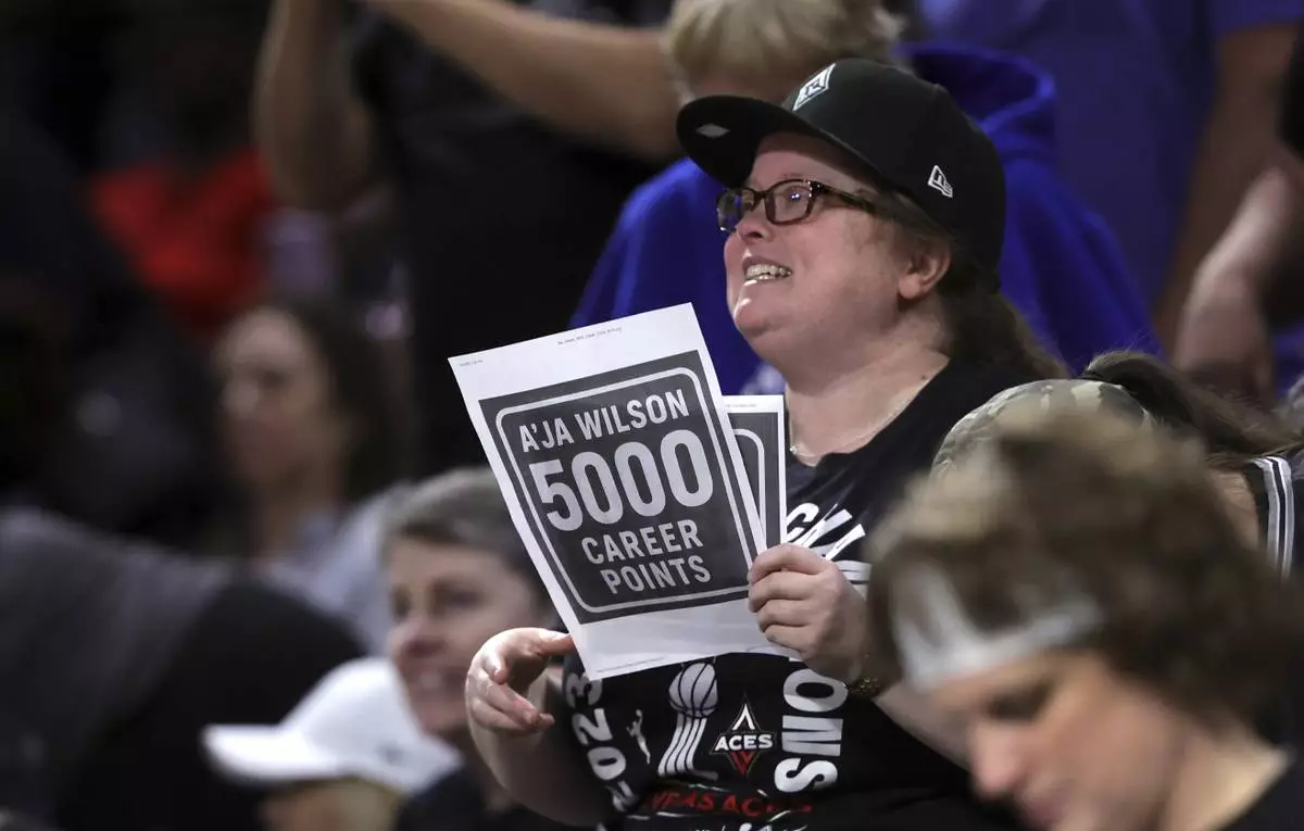 A fan holds a up a sign after Las Vegas Aces center A'ja Wilson (22) scores a basket to achieve her 5,000th career point in the WNBA during the first half of a WNBA basketball game against the Connecticut Sun, Wednesday, June 25, 2025, in Las Vegas. (Steve Marcus/Las Vegas Sun via AP)