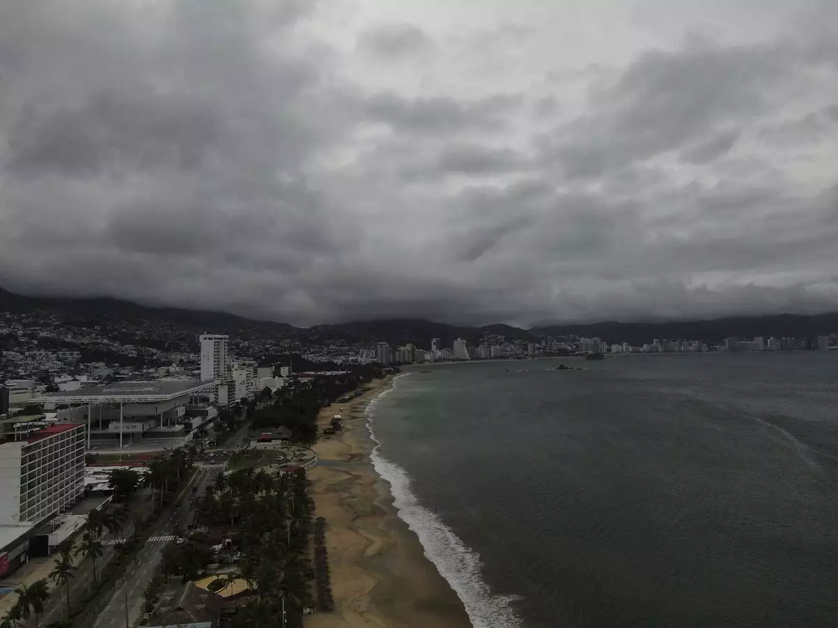 Acapulco Bay is void of boats while they are stored on shore as the nearby passing of Hurricane Erick brings dark clouds, Thursday, June 19, 2025. (AP Photo/Fernando Llano)