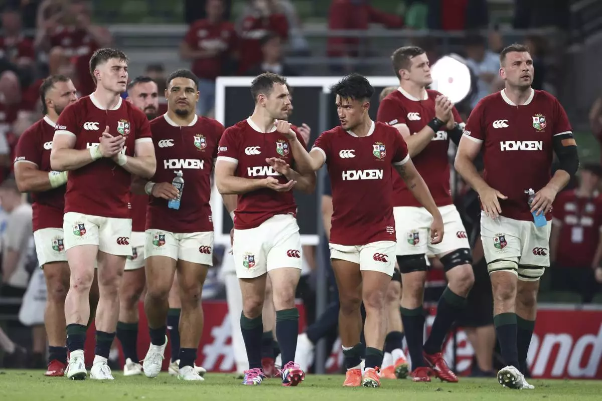 Lions' Marcus Smith, third right, gestures, as he, and teammates walk round the pitch as they acknowledge the fan after the end of the Rugby Union international match between the British and Irish Lions and Argentina, at the Aviva Stadium in Dublin, Friday, June 20, 2025. (AP Photo/Peter Morrison)
