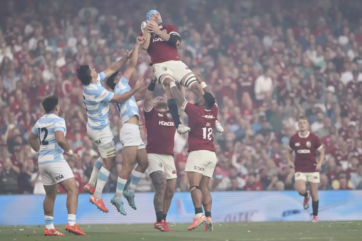 Lions' Tadhg Beirne, collects the ball at a line out during the Rugby Union international match between the British and Irish Lions and Argentina, at the Aviva Stadium in Dublin, Friday, June 20, 2025. (AP Photo/Peter Morrison)