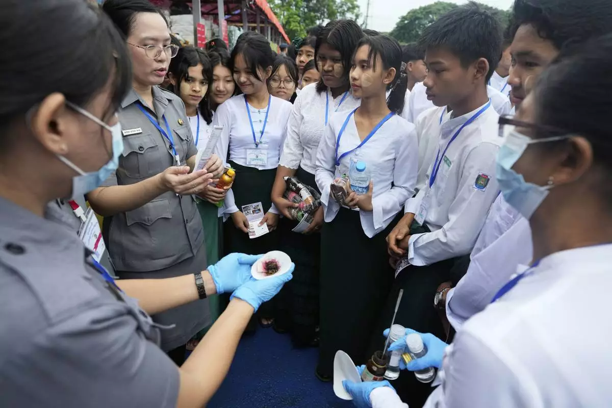 Police officers explain illegal narcotics to students during a destruction ceremony to mark International Day against Drug Abuse and Illicit Trafficking, on the outskirts of Yangon, Myanmar, Thursday, June 26, 2025. (AP Photo/Thein Zaw)