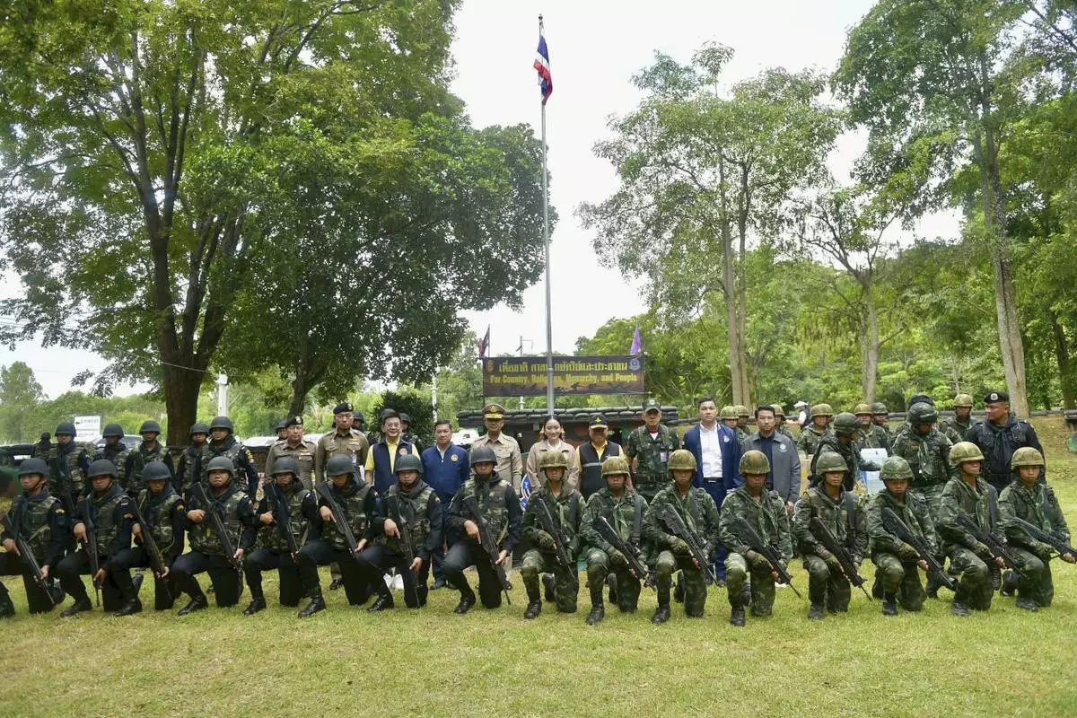 In this photo released by Thailand's Government Spokesman Office, Thailand's Prime Minister Paetongtarn Shinawatra, rear center, poses for media with Thai soldiers in Sa Kaeo Province Thailand, Thursday, June 26, 2025. (Thailand's Government Spokesman Office via AP)