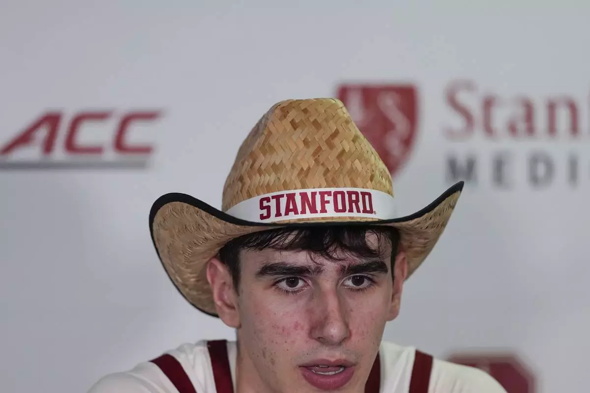 FILE - Stanford forward Maxime Raynaud talks to reporters during a press conference, following the team's victory over California in an NCAA college basketball game, on Feb. 22, 2025, in Stanford, Calif. (AP Photo/Godofredo A. Vásquez, File)