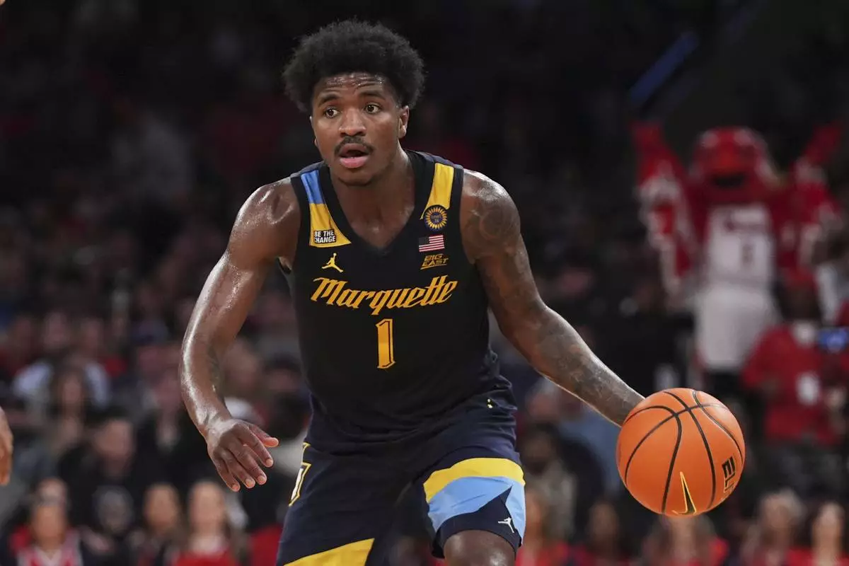 FILE - Marquette's Kam Jones (1) looks to pass during the second half of an NCAA college basketball game against the St. John's in the semifinals of the Big East tournament, on March 14, 2025, in New York. (AP Photo/Frank Franklin II, File)