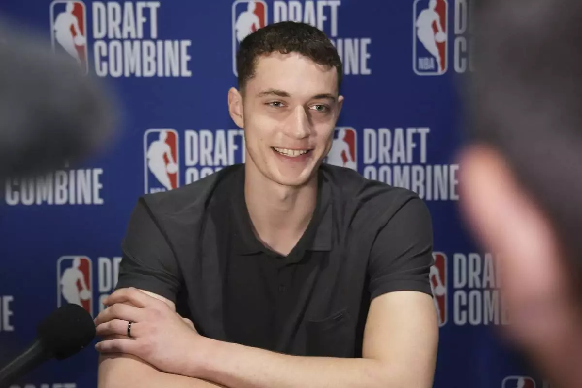 FILE - Ryan Kalkbrenner talks to media at the 2025 NBA basketball Draft Combine in Chicago, on May 14, 2025. (AP Photo/Nam Y. Huh, File)
